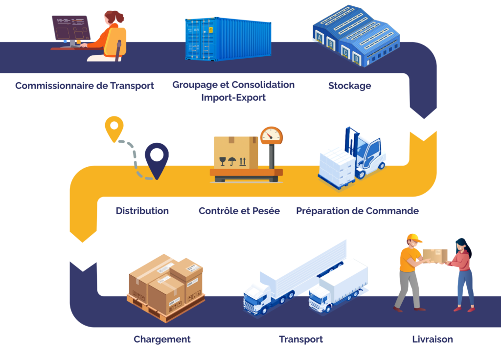 - Service complet « Door to door » en tant que commissionnaire de transport, de votre fournisseur à l’étranger jusqu’à l’expédition de vos commandes clients. Outil informatique performant avec lecture optique pour une gestion optimale.